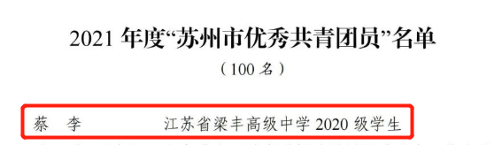 梁丰高级中学2020级14班团支部蔡李,他尊敬师长,友爱同学,乐于助人,积极参加志愿者服务和慈善募捐活动。2021年荣获“张家港市优秀共青团员”称号。 他热心公益,曾担任校唐仲英爱心社社长,在校内推广的“校内爱心雨伞”项目,深受学生好评;他积极参加社会实践,利用假期,他和小伙伴组建“青言青语”四史宣讲团,从话剧展演到社区宣讲,从“四史”知识学习到校外参观访谈,他用实践传播“四史”知识,用行动践行青年的责任与担当。他爱好学习,积极参加各级各类的比赛,并在“全国中学生英语能力测评”中获全国三等奖;“外研社杯”全国中学生外语素养大赛江苏省决赛一等奖;第十四届“地球小博士”全国地理科普知识大赛中获全国一等奖。