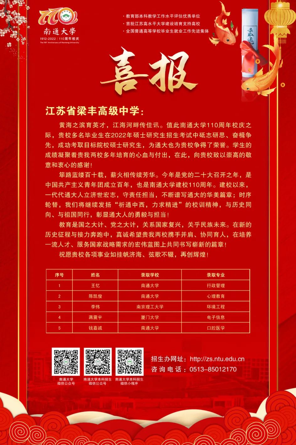 南通大学向梁丰高中发来喜报 来源: 发布时间:2022-05-30 07:45:55 浏览次数: 次 【字体:小 大】 喜报南通大学向梁丰高中发来喜报,祝贺梁丰学子在硕士研究生招生考试中砥志研思、奋楫争先,成功考取目标院校硕士研究生。希望未来两校携手并肩、协同育人,在培养一流人才、服务国家战略需求的宏伟蓝图上共同书写崭新的篇章!↑长按,识别二维码,加关注 分享到: 【打印正文】