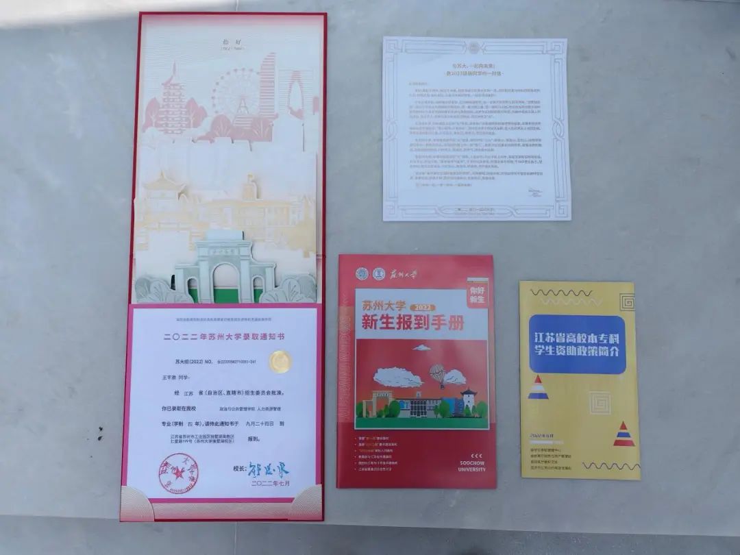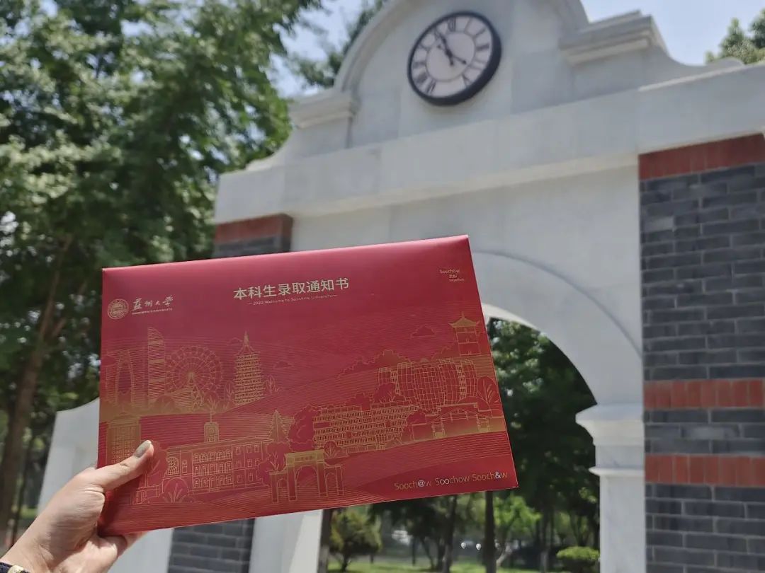 苏大今年录取通知书的主题是“交织东吴梦,共绘新篇章”,通过符号元素将城市记忆、校园纽带、未来想象三个主题词交织在一起,寓意着你与苏州、与苏大校园以通知书为纽带交织在一起,共赴一场盛大的时空之旅。