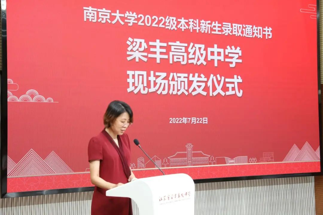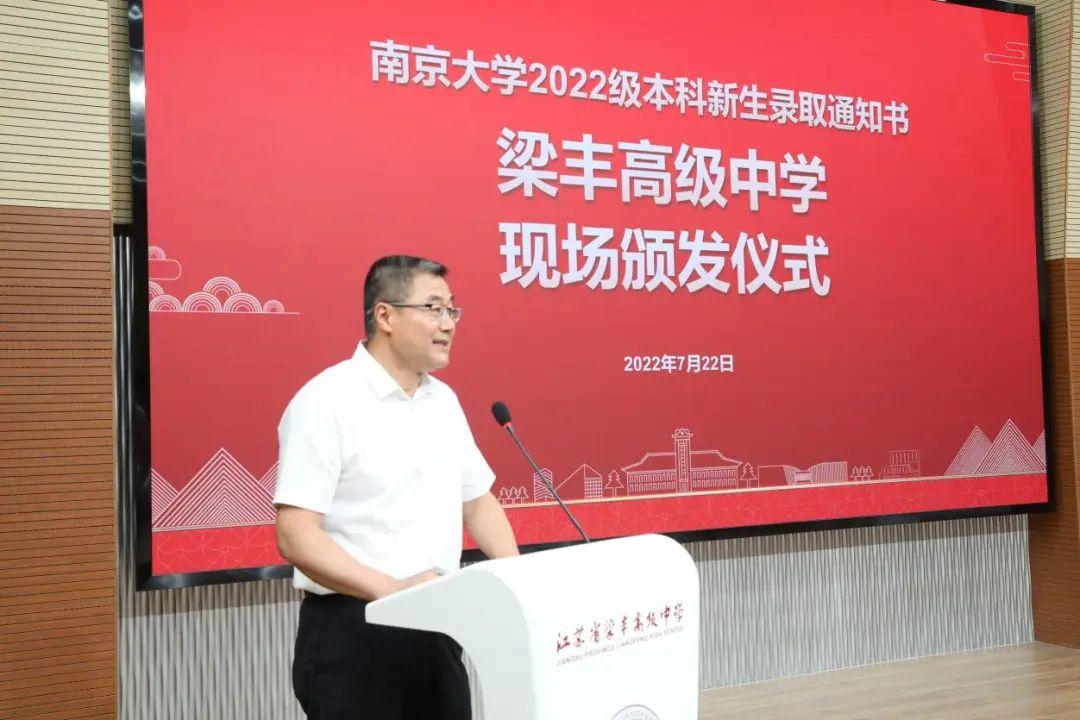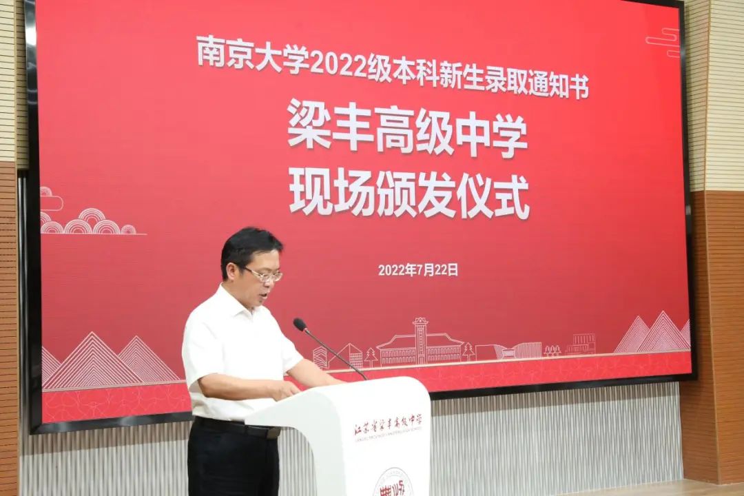 7月22日下午,南京大学党委副书记薛海林教授、南京大学苏州地区招生负责人黄细良教授、南京大学计算机系与软件学院党委副书记陈琳教授、南京大学苏州校区本科生学院江幼默教授来到梁丰高中,为录取南京大学的2022届梁丰学子颁发录取通知书。张家港市委教育工委书记、教育局局长杨志刚,张家港市教育局副局长朱治国,江苏省梁丰高级中学党委书记、校长谈雅琴,党委副书记、副校长陈礼林,副校长张新宇,副校长周汉东,副校长王昊,副校长蒋霞,高三年级组组长朱丽主任,以及20位录取南京大学的学生及家长共同参加了本次活动。活动由周汉东副校长主持。