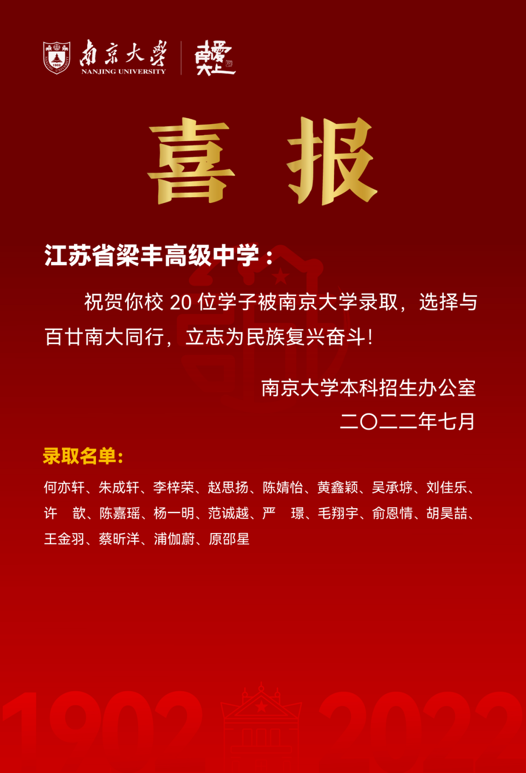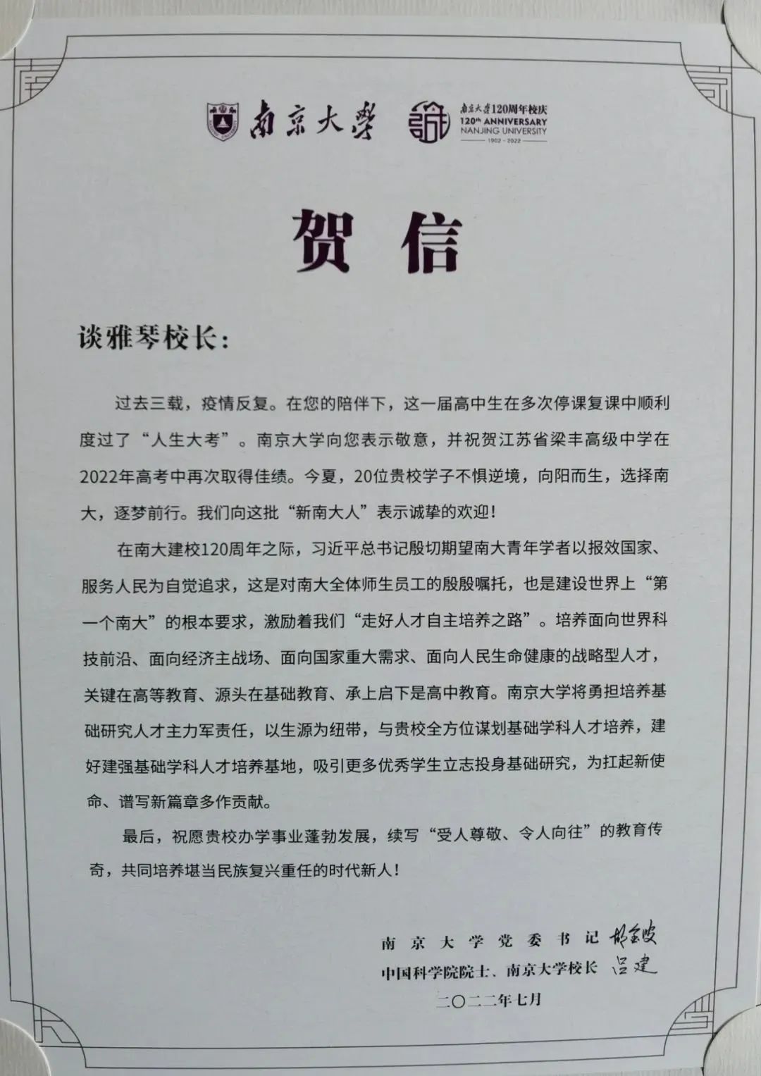 南京大学的录取通知书拿到手,意味着人生的一段新的旅程即将开始,衷心祝愿同学们在未来的四年或是更长的一段时间里,牢记梁丰“勤业慎行”之校训,继续发扬张家港精神,在南京大学的文化熏陶中茁壮成长,创造出新的辉煌。