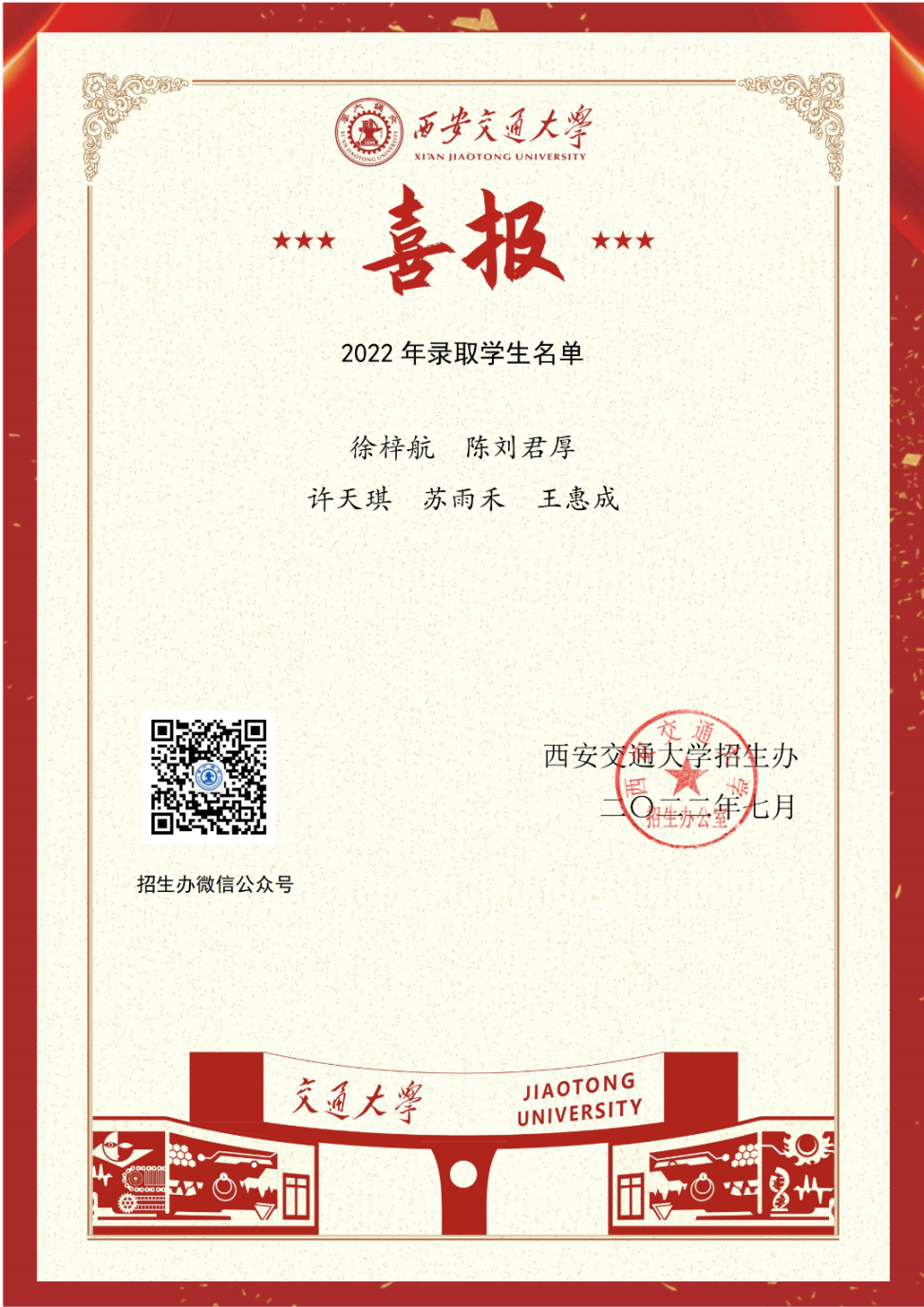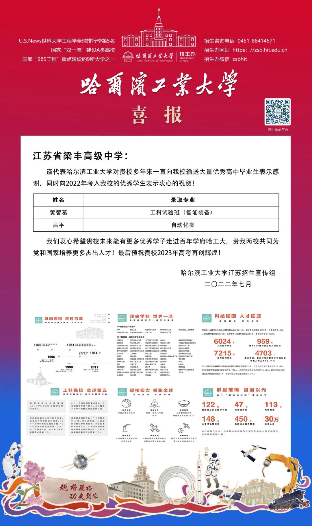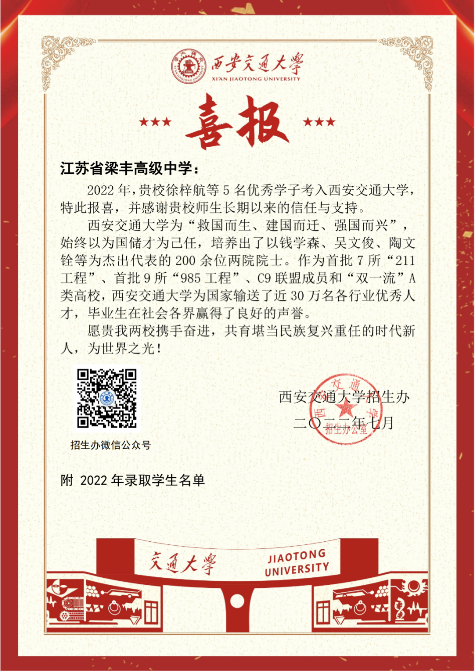 喜报丨哈尔滨工业大学、西安交通大学向梁丰高中发来喜报 来源: 发布时间:2022-07-28 15:20:52 浏览次数: 次 【字体:小 大】 喜报近日,哈尔滨工业大学、西安交通大学向梁丰高中发来喜报,祝贺梁丰学子以优异成绩考入高校。希望未来继续紧密合作,共同为祖国培养更多英才!梁丰高中始终秉承为国植贤的新时代初心和使命,把立德树人作为教育的根本任务,为党育人、为国育人,培养“品端成梁,学粹至丰,具有家国情怀和创新能力的时代新人”,建办让人民满意的教育!审核发布丨高慈↑长按,识别二维码,加关注 分享到: 【打印正文】