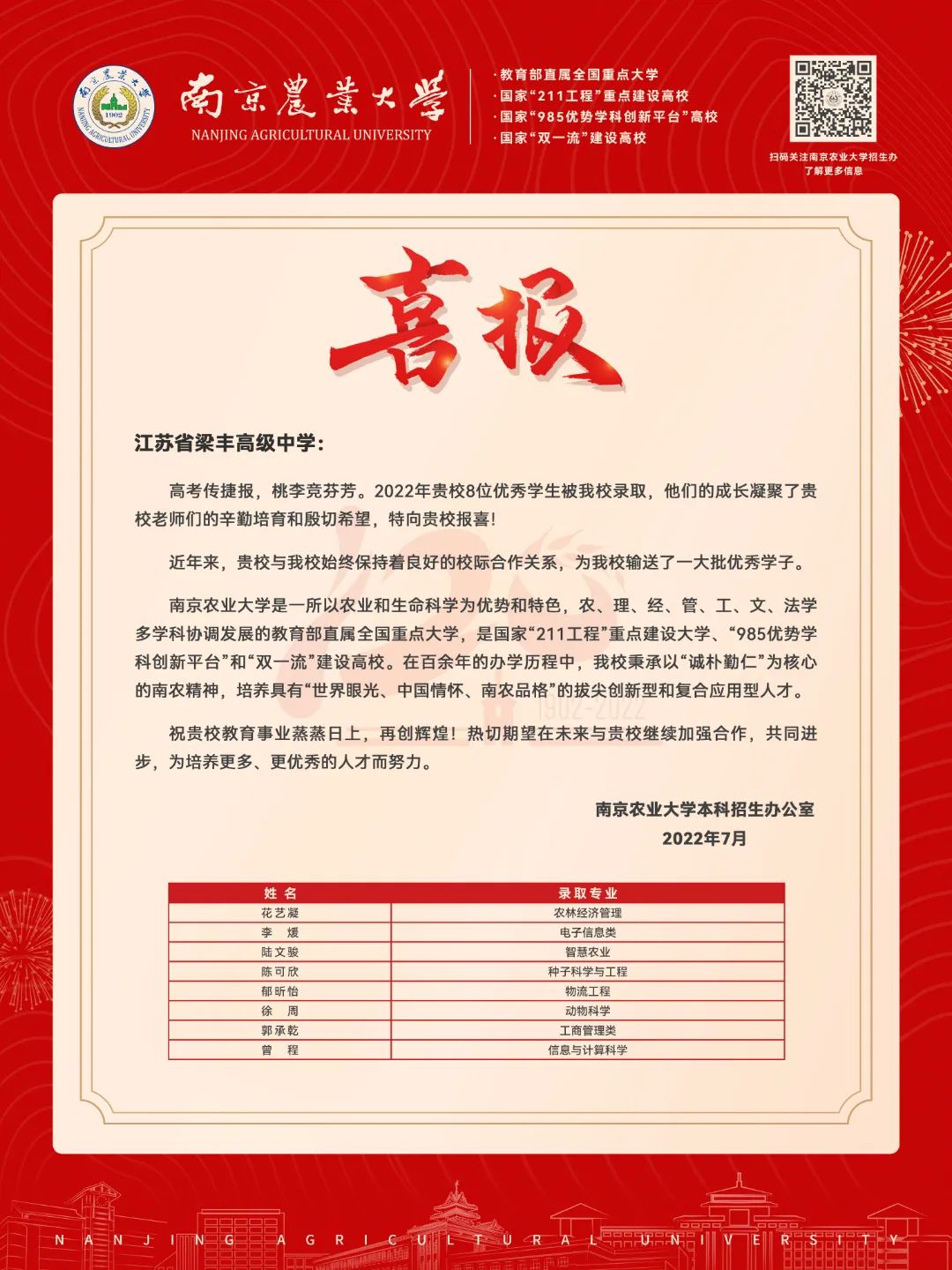 喜报丨南京林业大学、南京农业大学向梁丰高中发来喜报 来源: 发布时间:2022-08-01 15:50:54 浏览次数: 次 【字体:小 大】 喜报近日,南京林业大学、南京农业大学向梁丰高中发来喜报,祝贺梁丰学子以优异成绩考入高校。希望未来继续紧密合作,共同为祖国培养更多英才!梁丰高中始终秉承为国植贤的新时代初心和使命,把立德树人作为教育的根本任务,为党育人、为国育人,培养“品端成梁,学粹至丰,具有家国情怀和创新能力的时代新人”,建办让人民满意的教育!审核发布丨高慈↑长按,识别二维码,加关注 分享到: 【打印正文】