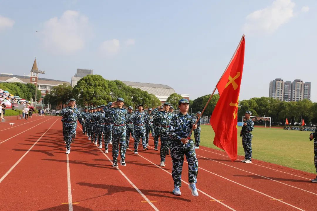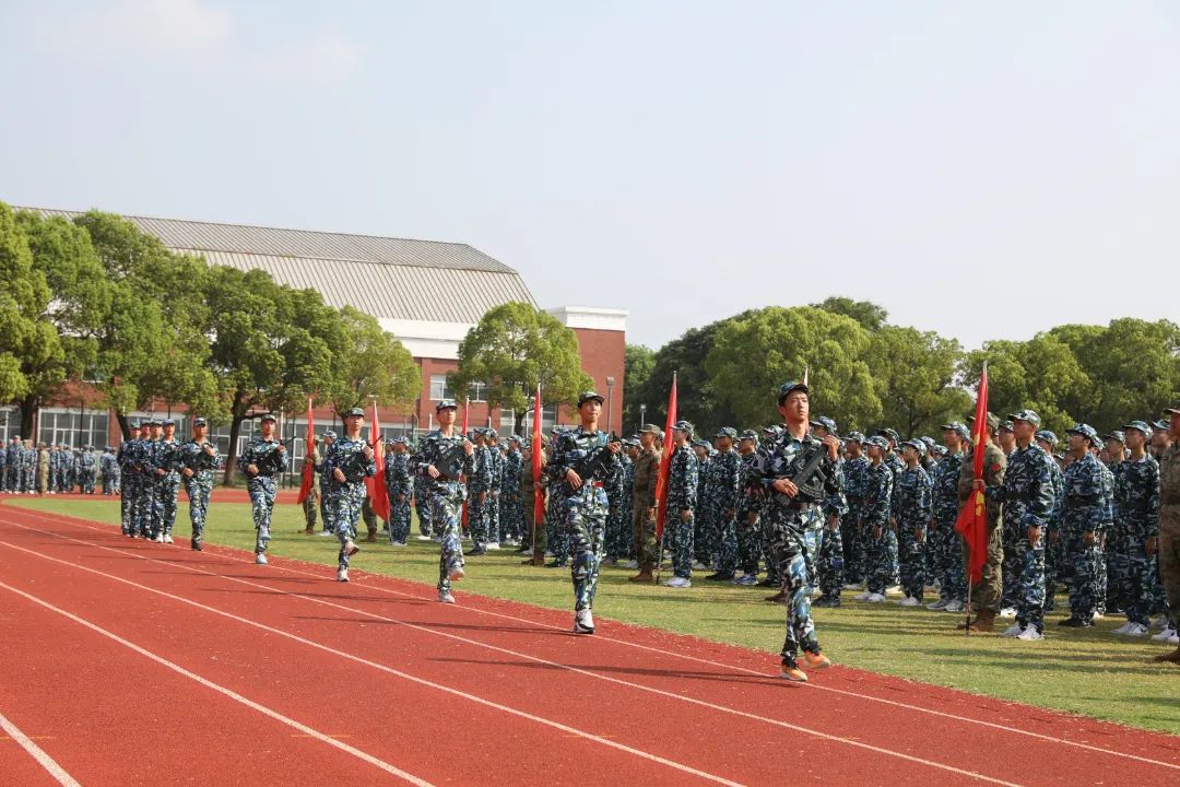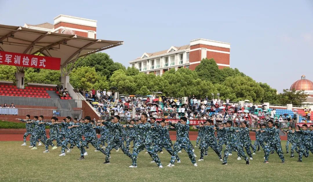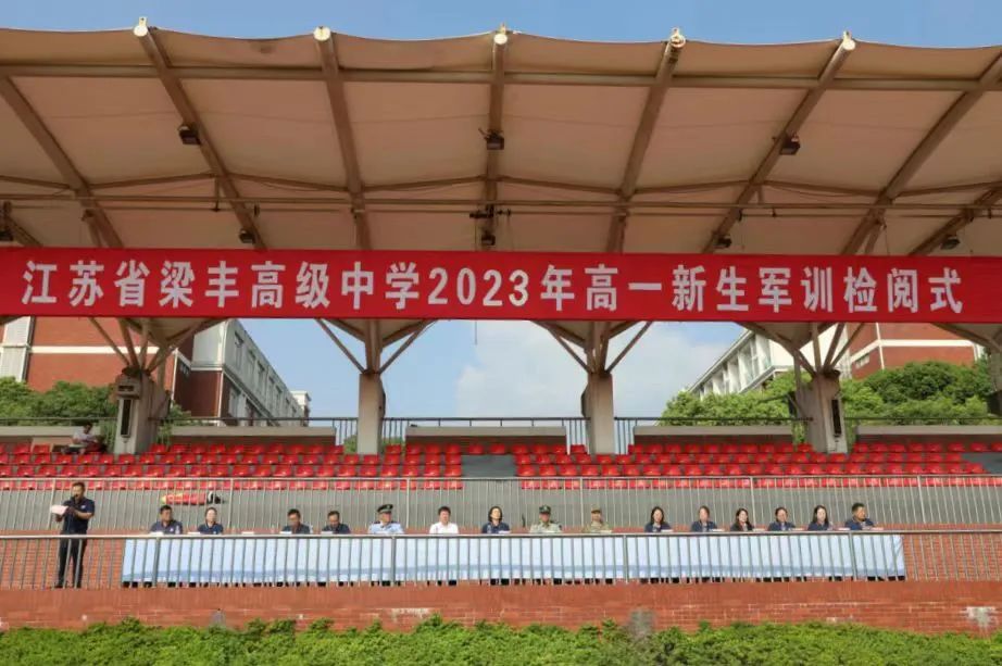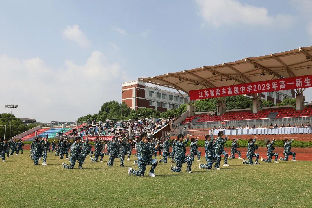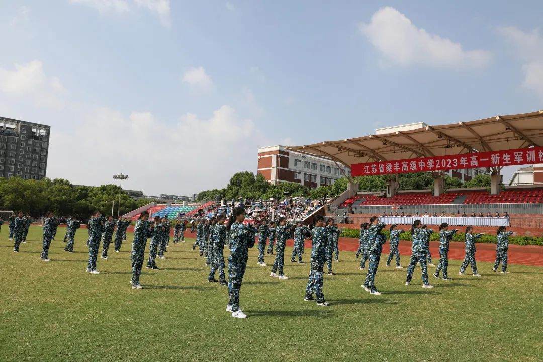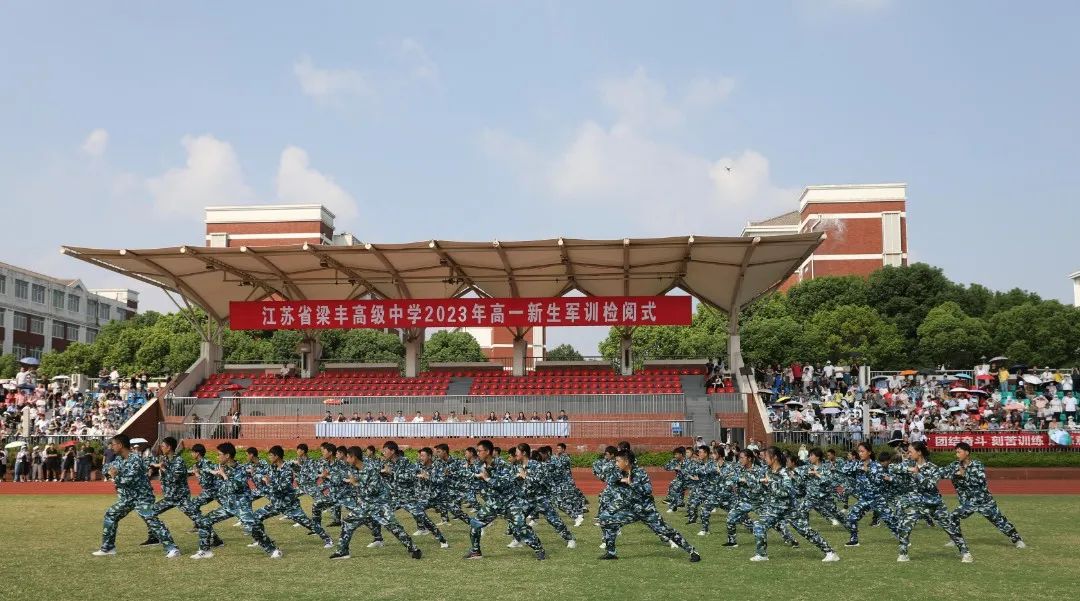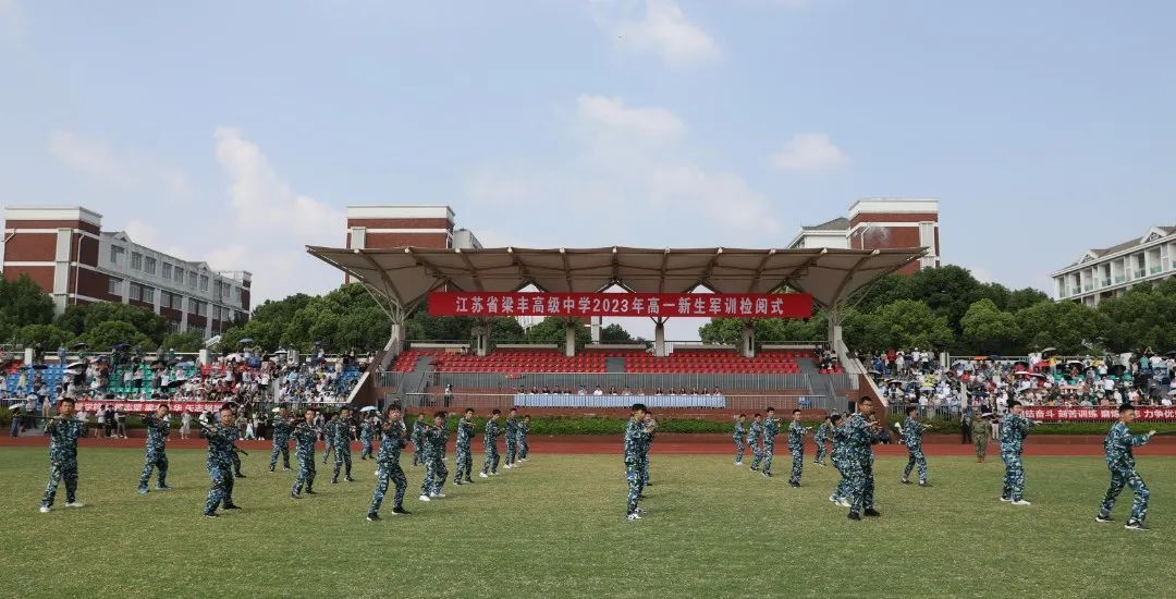 8月25日上午,江苏省梁丰高级中学2023年新生军训检阅式在田径场隆重举行。